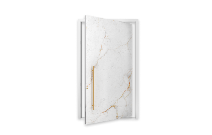 W naszej ekskluzywnej propozycji wypełnienia drzwiowego użyliśmy unikalnego spieku kwarcowego. Złote wzory wkomponowane w powierzchnię wypełnienia efektownie błyszczą na delikatnym białym tle o satynowym wykończeniu.